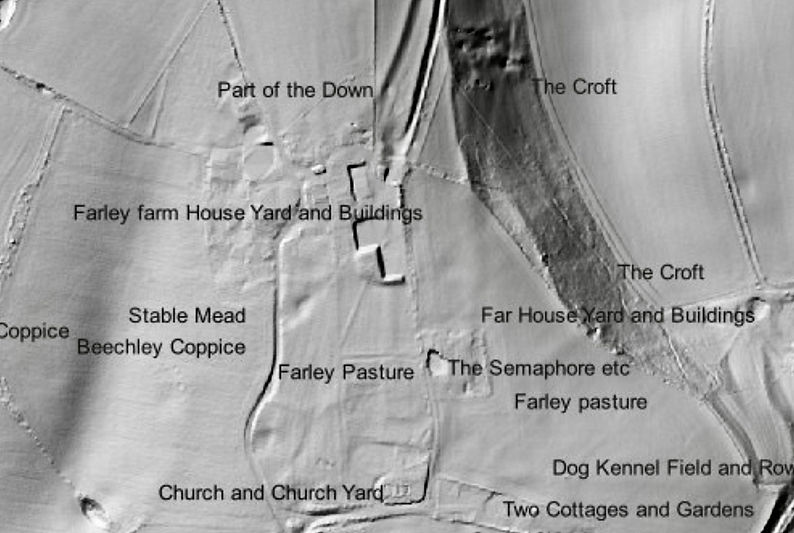 In this LiDAR image, Farley church and churchyard are in the lower right corner of the rectangular enclosure, with the site of Farley House to the north. An oval feature northwest of the churchyard is probably part of the garden.